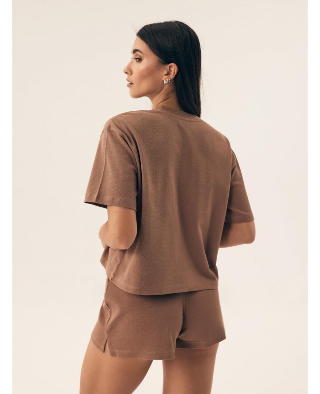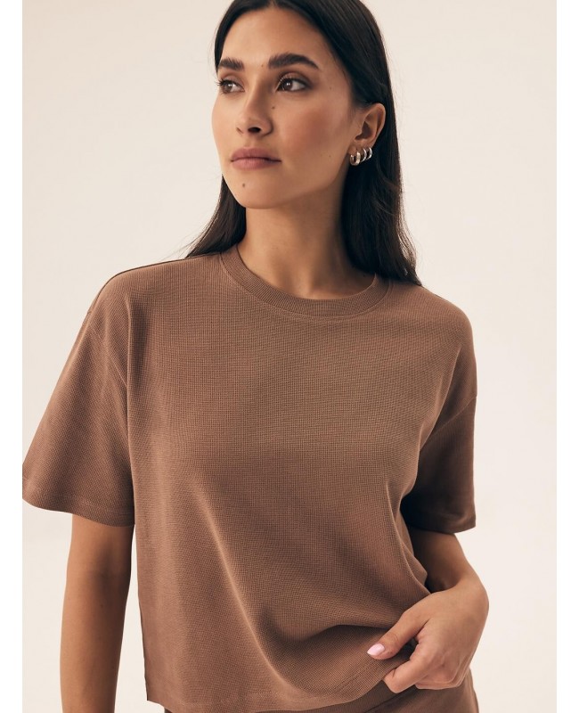 Piżama damska Henderson Ladies 42780 Nilsa to wygodny komplet nocny z wysokiej jakości bawełny o strukturze wafla. Luźna koszulka z krótkim rękawem i półokrągłym dekoltem zapewnia komfort i przewiewność. Krótkie spodenki z szeroką gumą w pasie i małymi rozcięciami po bokach zwiększają swobodę ruchów. Całość utrzymana w modnym, minimalistycznym stylu. Idealna na cieplejsze noce lub jako domowy strój relaksacyjny. Dostępna w rozmiarach S–XL.