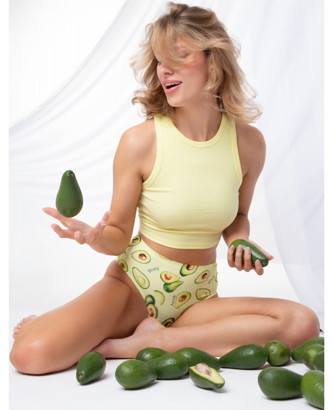 Miękka i elastyczna mikrofibra została ozdobiona nadrukiem w modne i zabawne motywy owocowe – awokado. Tkanina jest lekka, przyjemna w dotyku, a jednocześnie trwała i przewiewna. Dzięki domieszce elastanu bielizna doskonale dopasowuje się do sylwetki, nie powodując ucisku.