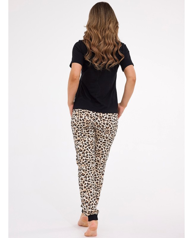 Długie spodnie przyciągają uwagę modnym wzorem w panterkę. W pasie znajduje się elastyczna gumka oraz troczek umożliwiający regulację obwodu. Spodnie posiadają także boczne kieszenie, które zwiększają funkcjonalność całego zestawu. Nogawki zostały zakończone jednolitymi ściągaczami – dzięki temu dobrze leżą i nie podwijają się podczas snu.