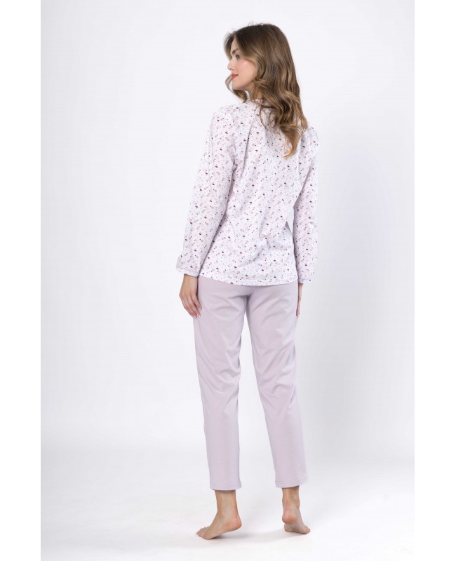 Bluzka w delikatnym, biało-liliowym odcieniu przyciąga wzrok dzięki subtelnemu, drobnemu wzorowi kwiatowemu, który nadaje jej lekkości i kobiecego uroku. Okrągły dekolt został ozdobiony kontrastową taśmą, a długi rękaw zakończony mankietem zapewnia dodatkowe ciepło – idealne rozwiązanie na chłodniejsze noce. Praktyczna kieszonka na piersi podnosi funkcjonalność całego zestawu, co czyni tę piżamę znakomitą także jako piżama damska bawełniana rozpinana do szpitala.