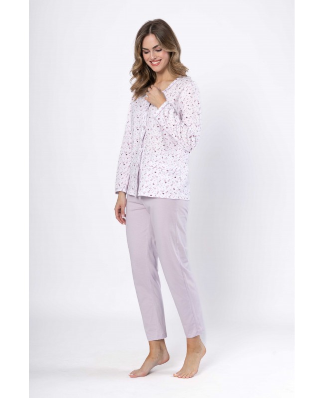 Bawełniana piżama damska rozpinana LEVEZA DANUTA 1637 to doskonały wybór dla kobiet ceniących wygodę i klasyczny styl. Wykonana z wysokiej jakości 100% bawełny, idealna jako piżama damska rozpinana do szpitala lub na co dzień. Bluzka z długim rękawem, ozdobiona kontrastową taśmą i praktyczną kieszonką, ma uroczy kwiatowy wzór. Spodnie 7/8 w liliowym kolorze podkreślają kobiecy charakter zestawu. Dostępna w rozmiarach M–4XL, świetna jako piżama dla babci lub dla każdej kobiety ceniącej eleganckie piżamy damskie bawełniane.