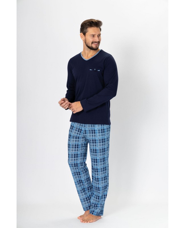 Piżama męska HOTBERG LEON 993 to klasyczna propozycja dla mężczyzn ceniących wygodę, funkcjonalność i styl. Wykonana z wysokiej jakości bawełny 100%, zapewnia komfort i przewiewność przez cały rok. Koszulka z długim rękawem posiada praktyczną kieszeń oraz dekolt w serek, który dodaje elegancji. Długie spodnie w klasyczną kratę idealnie komponują się z gładką górą, tworząc estetyczny i wygodny zestaw na chłodniejsze noce. Doskonała jako piżama męska bawełniana długi rękaw do codziennego użytku lub na prezent.