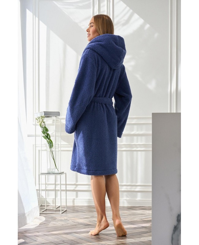 Model wyróżnia się starannym wykończeniem oraz klasycznym fasonem. Długi rękaw zapewnia ciepło i swobodę ruchów, a praktyczny kaptur dodaje nie tylko uroku, ale i funkcjonalności – świetnie sprawdzi się po kąpieli czy w chłodniejsze dni, gdy potrzebujemy dodatkowego otulenia. Pasek do wiązania w pasie pozwala na idealne dopasowanie do sylwetki, podkreślając talię i nadając całości kobiecego charakteru.
