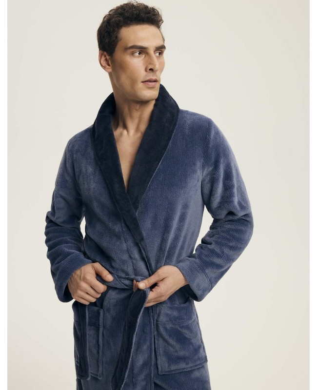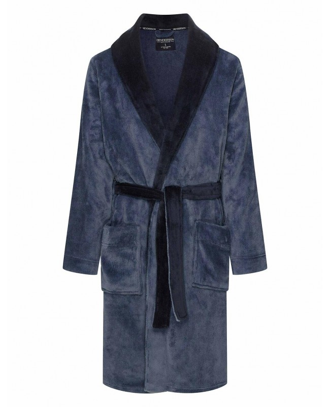 Szlafrok męski Henderson 43375 Nantes to klasyczny model o eleganckim, ponadczasowym charakterze. Wykonany z miękkiej, przyjemnej dzianiny o strukturze prążka imitującego sztruks, zapewnia komfort noszenia i ciepło w chłodniejsze dni. Szalowy kołnierz nadaje mu szyku, a kontrastujące wykończenia podkreślają nowoczesny styl. Model wiązany w pasie, z długością do kolan, gwarantuje wygodę i swobodę ruchów. Dwie zewnętrzne kieszenie zwiększają funkcjonalność i praktyczność użytkowania. Polski produkt marki Henderson – idealny dla mężczyzn ceniących elegancję, jakość i komfort w domowym zaciszu.