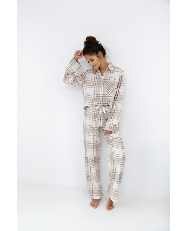 Piżama damska Sensis Adalyn to połączenie klasycznego stylu z wyjątkową wygodą. Wykonana z miękkiej, ciepłej flaneli bawełnianej, doskonale sprawdzi się w chłodniejsze dni. Koszula z kołnierzykiem i pełnym rozpięciem na guziki nadaje całości eleganckiego charakteru, a praktyczna kieszonka na piersi dodaje funkcjonalności. Długie spodnie z gumką w pasie i wiązanym troczkiem zapewniają idealne dopasowanie do sylwetki. Stylowy wzór w kratkę to ponadczasowy wybór, który nigdy nie wychodzi z mody.