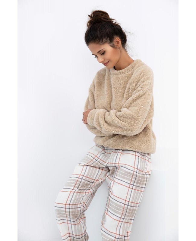Górna część zestawu to gruba bluza z dzianiny typu soft, niezwykle delikatnej i aksamitnej w dotyku. Jej puszysta struktura zapewnia przyjemne ciepło nawet w najchłodniejsze noce. Dzianina ta nie tylko izoluje od zimna, ale także pięknie się prezentuje — nadając piżamie wyjątkowo elegancki, domowy charakter. Bluza posiada długi rękaw oraz dekolt i mankiety wykończone ściągaczami, co zapewnia idealne dopasowanie i wygodę w noszeniu.