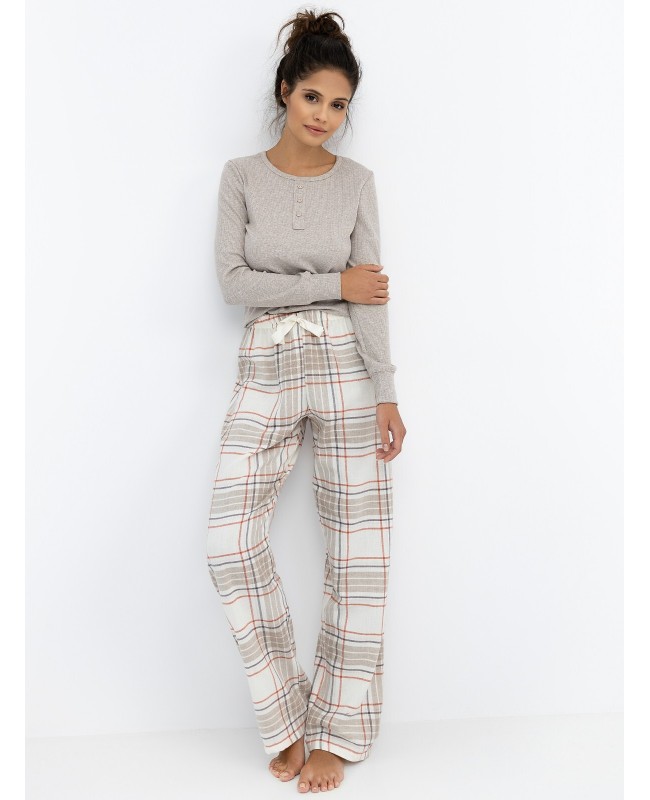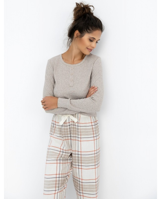 Model Angelina to zestaw dwóch tkanin doskonale dopasowanych do siebie – melanżowa dzianina w drobny prążek w górnej części i flanela bawełniana w klasyczną kratkę w spodniach. Takie połączenie tworzy idealny balans między lekkością a ciepłem, zapewniając komfort zarówno w chłodne noce, jak i podczas leniwych poranków w domu.