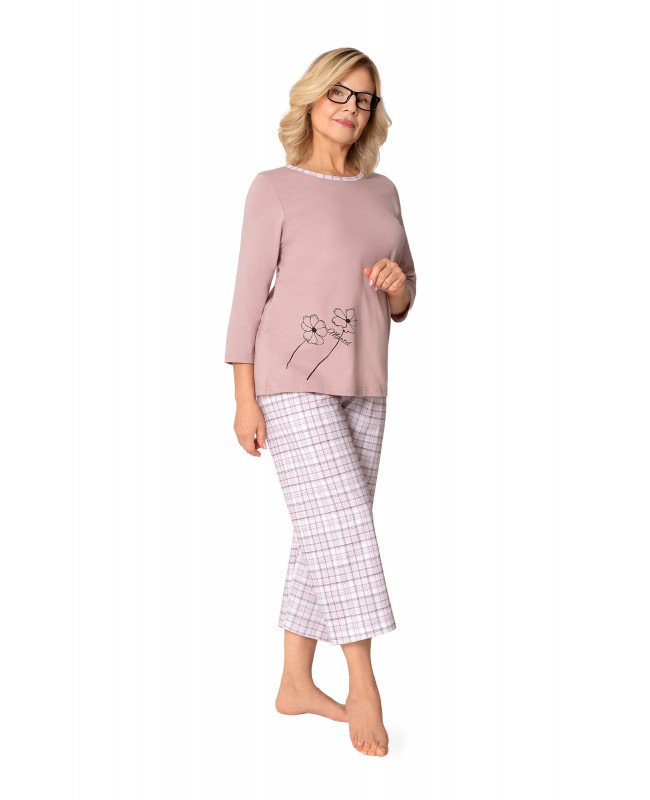 Góra piżamy została zaprojektowana w stonowanym, pudrowym odcieniu, który wprowadza harmonię i spokój. Rękaw 3/4 to idealne rozwiązanie na cały rok – nie jest ani za ciepło, ani za chłodno, a fason zapewnia wygodę w każdej pozycji. Delikatna aplikacja kwiatowa umieszczona subtelnie na boku dodaje całości lekkości i kobiecego uroku, nie dominując stylu, lecz pięknie go podkreślając.