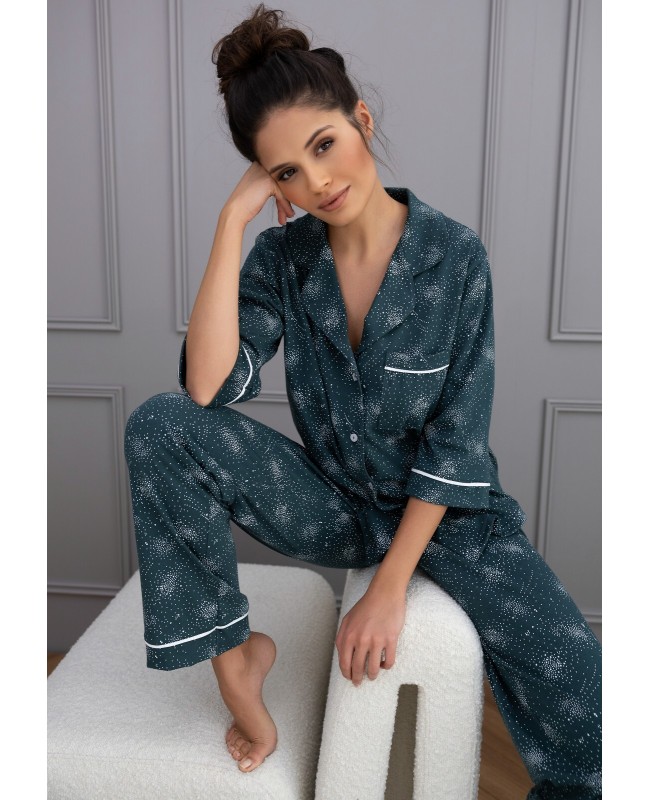 To model wyjątkowy, który łączy klasykę koszulowej formy z wygodą tradycyjnej piżamy z bawełny. Górę zestawu tworzy bluza z rękawem 3/4 oraz eleganckim kołnierzykiem. Zapięcie na guziki dodaje jej szyku, a jednocześnie jest praktyczne i wygodne. Taki krój pięknie układa się na sylwetce i sprawdza się idealnie zarówno w trakcie snu, jak i podczas porannej kawy czy wieczornego relaksu.
