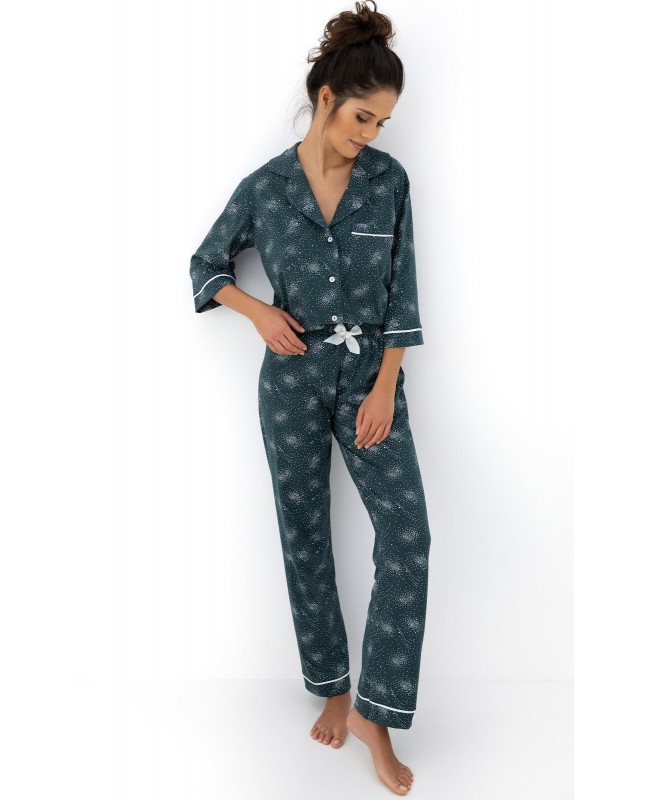 Piżama damska Sensis Sydney to elegancki i niezwykle wygodny komplet wykonany w 100% z wysokogatunkowej bawełny. Bluza z rękawem 3/4, klasycznym kołnierzykiem i zapięciem na guziki nadaje całości stylu inspirowanego koszulą nocną premium. Długie spodnie z gumką obszytą bawełną oraz satynową kokardką zapewniają wysoki komfort i delikatny, kobiecy akcent. Naturalna tkanina gwarantuje przewiewność, miękkość i trwałość, dzięki czemu model Sydney jest doskonałym wyborem na każdą porę roku.