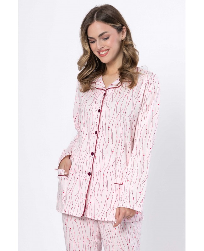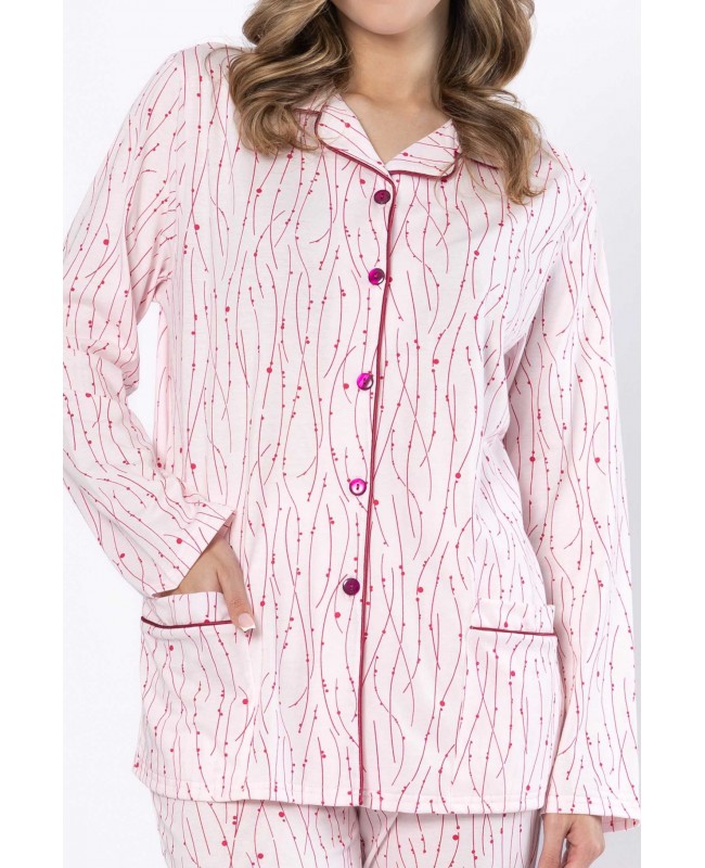 Model składa się z rozpinanej góry z długim rękawem oraz klasycznych, długich spodni. Koszulowa forma z kołnierzykiem nadaje piżamie elegancki wygląd, a jednocześnie zapewnia wygodę użytkowania. Zapięcie na guziki ułatwia zakładanie i zdejmowanie, co docenisz szczególnie wieczorem i o poranku. Praktyczne kieszenie zwiększają funkcjonalność i sprawiają, że piżama sprawdzi się nie tylko do spania, ale również jako domowy strój do relaksu.