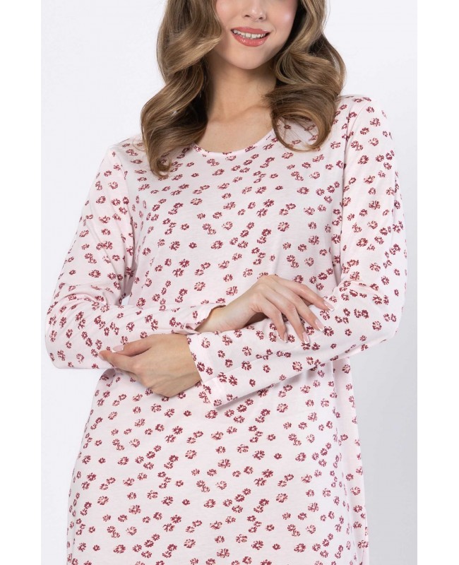 Klasyczny fason o długości do kolan gwarantuje komfort snu oraz pełną swobodę ruchów. Długi rękaw sprawia, że koszula świetnie sprawdzi się w chłodniejsze wieczory i poranki, a półokrągły dekolt podkreśla prostą, ponadczasową formę. Subtelny, drobny wzór dodaje całości lekkości i estetycznego wyglądu, dzięki czemu koszula prezentuje się schludnie również jako strój domowy.