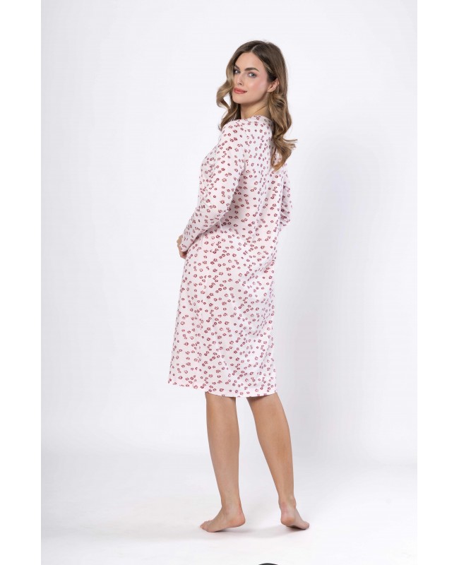 Koszula nocna damska Gelazja to idealne połączenie naturalnego komfortu, klasycznego fasonu i kobiecej estetyki. Wykonana z wysokiej jakości bawełny, jest miękka, przewiewna i przyjazna dla skóry, dzięki czemu zapewnia wygodny sen przez cały rok. Długi rękaw i długość do kolan sprawiają, że model doskonale sprawdzi się także w chłodniejsze noce. Prosty, luźny krój nie krępuje ruchów i gwarantuje swobodę podczas snu oraz domowego wypoczynku. Delikatny, drobny wzór nadaje koszuli subtelnego charakteru. Koszula Gelazja to doskonały wybór dla kobiet ceniących wygodę, naturalne materiały i ponadczasowy styl.