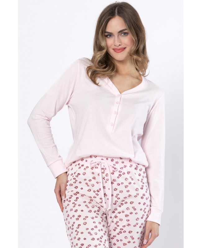 Ten model zachwyca subtelną kolorystyką oraz harmonijnym połączeniem gładkiej góry z delikatnie wzorzystymi spodniami. Bluzka z długim rękawem posiada klasyczny, lekko zaokrąglony dekolt zapinany na guziki, co nadaje całości ponadczasowego charakteru i zwiększa funkcjonalność. Prosty, wygodny fason nie krępuje ruchów i doskonale układa się na sylwetce.