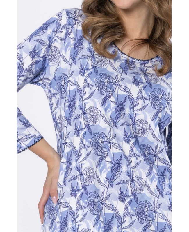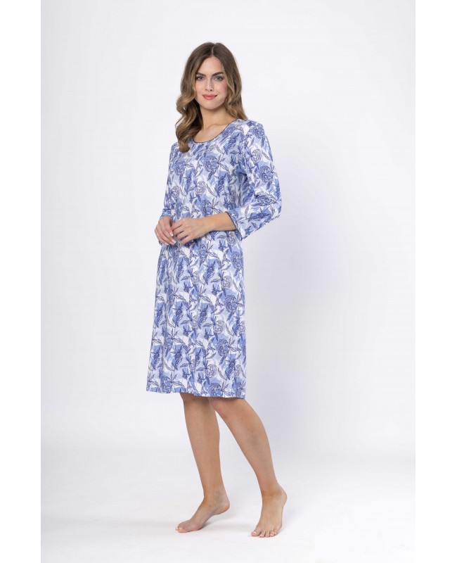 Koszula nocna damska EUFEMIA to połączenie naturalnego komfortu, kobiecego stylu oraz wysokiej jakości wykonania. Uszyta z miękkiej i oddychającej bawełny zapewnia wygodę noszenia przez całą noc oraz swobodę ruchów. Delikatny, kwiatowy wzór w odcieniach niebieskiego nadaje całości lekkości i ponadczasowej elegancji. Długi rękaw sprawia, że koszula doskonale sprawdzi się również w chłodniejsze noce, a klasyczna długość do kolan gwarantuje komfort i poczucie swobody.