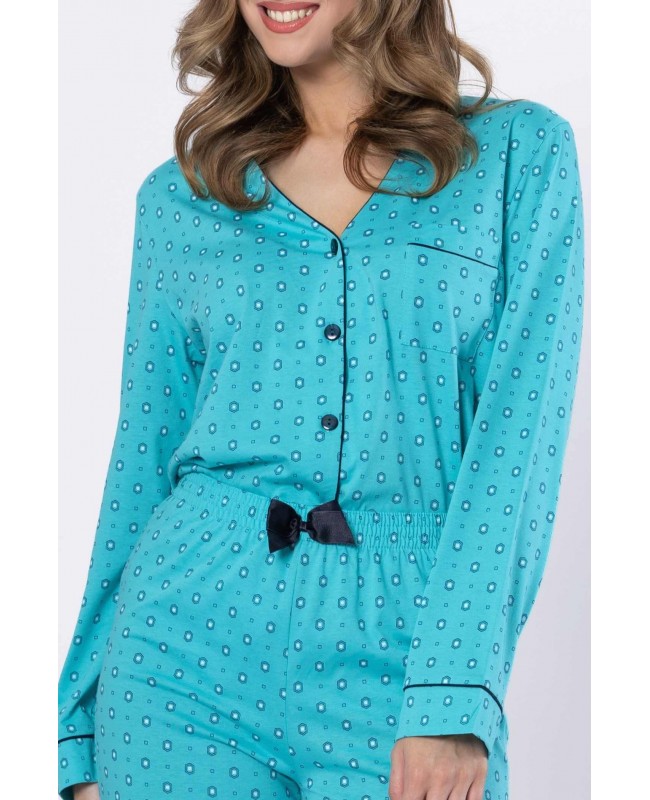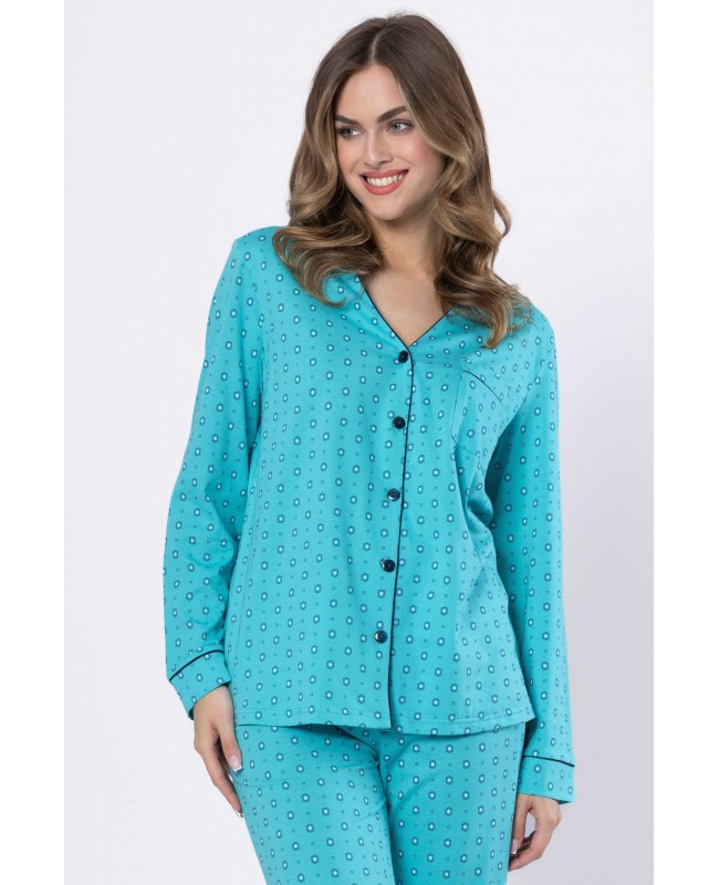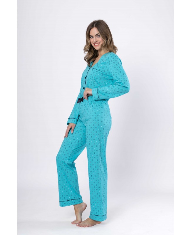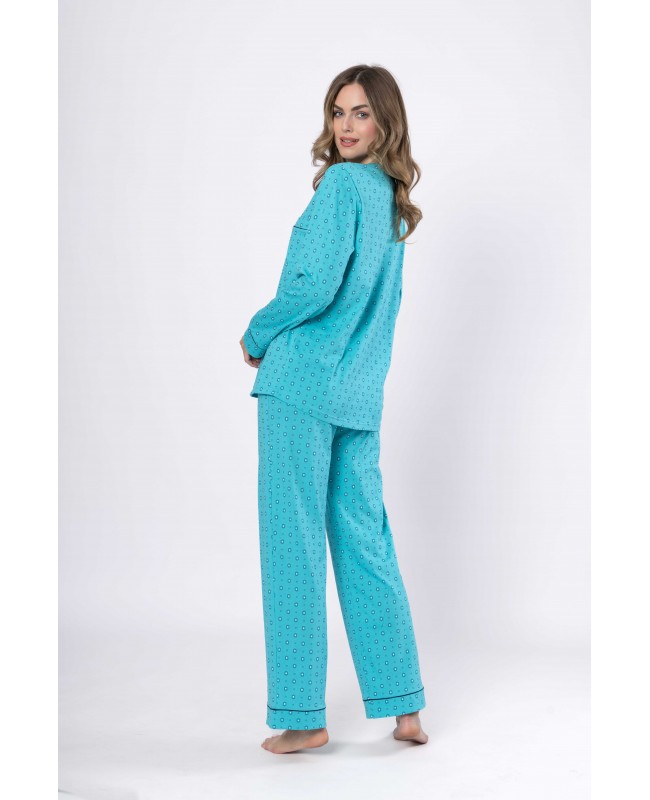 Spodnie o długich nogawkach zapewniają komfort termiczny i pełną swobodę ruchów. Elastyczna talia delikatnie dopasowuje się do sylwetki, nie uciskając i nie ograniczając wygody. Całość utrzymana jest w świeżej, turkusowej kolorystyce z drobnym, geometrycznym wzorem, który nadaje piżamie nowoczesny, a jednocześnie ponadczasowy charakter.