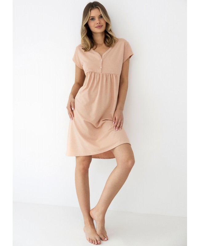 Koszula nocna damska Sensis Goldie to połączenie wygody, kobiecego kroju i funkcjonalnych detali, które sprawdzają się na co dzień. Wykonana z miękkiej dzianiny bawełnianej z dodatkiem włókien elastycznych, delikatnie dopasowuje się do sylwetki i zapewnia komfort noszenia przez całą noc. Model z krótkim rękawem, dekoltem w kształcie litery V oraz zapięciem na guziki prezentuje się lekko i elegancko. Marszczenie pod biustem subtelnie podkreśla figurę, a długość przed kolano zapewnia swobodę ruchów. Koszula idealnie sprawdzi się również dla mam karmiących.