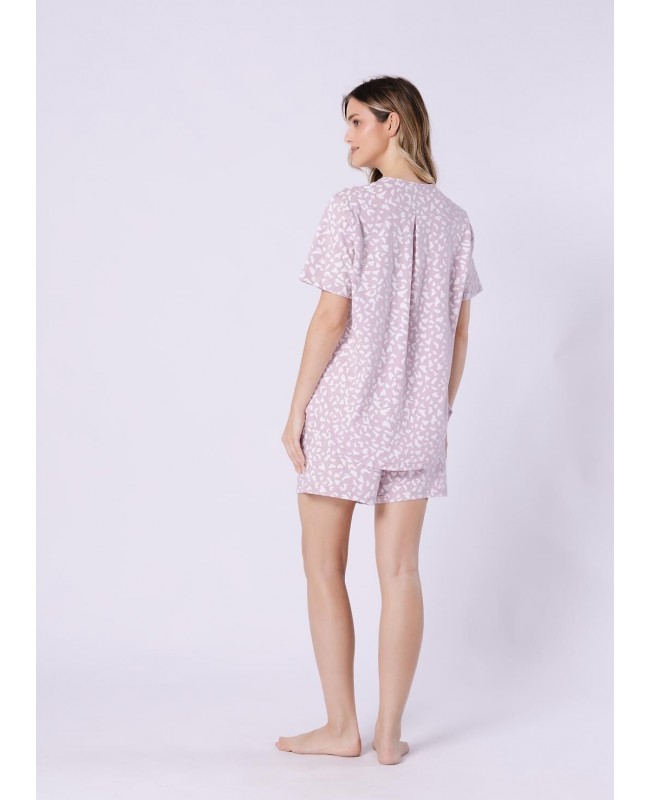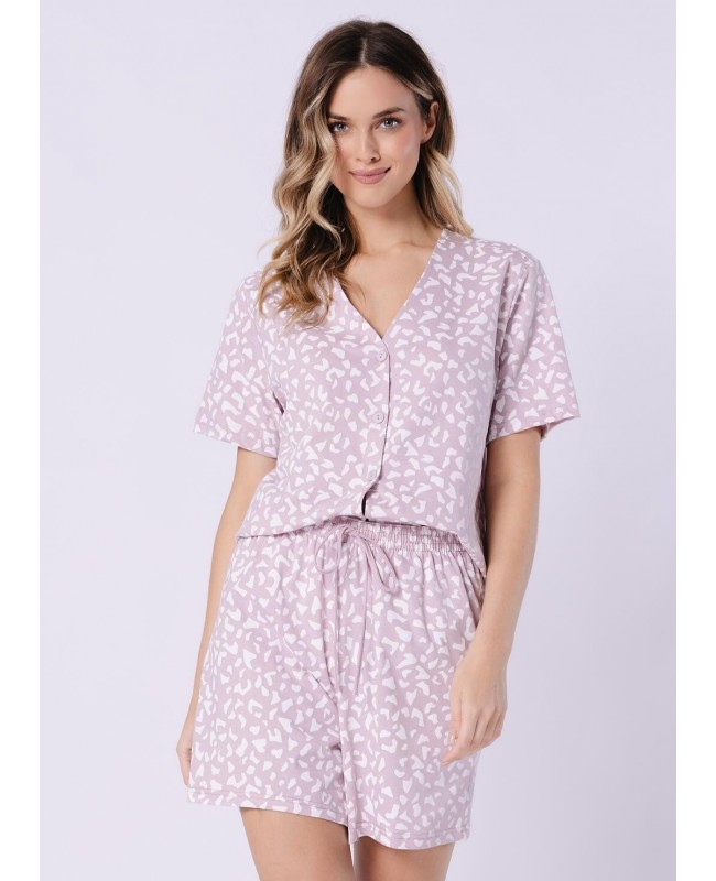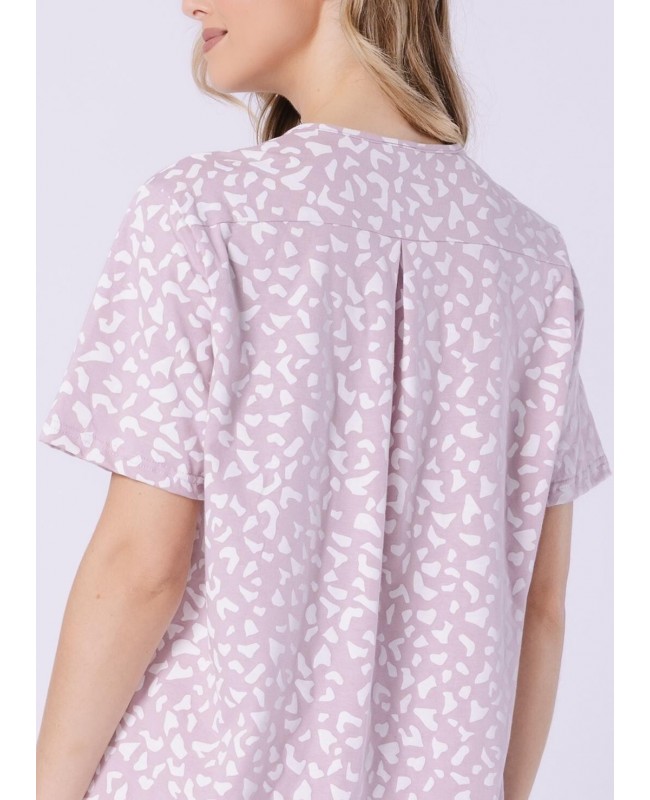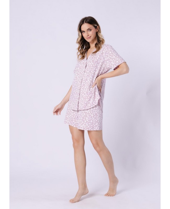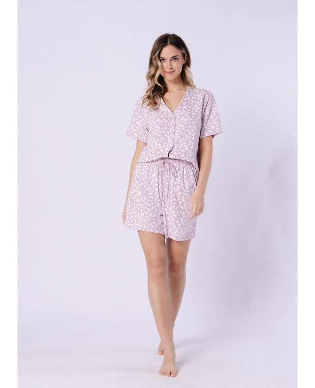 Górna część kompletu to wzorzysta koszulka z krótkim rękawem, zapinana na guziki. Rozpinana forma ułatwia zakładanie i sprawia, że piżama jest wyjątkowo praktyczna w codziennym użytkowaniu. Dekolt w kształcie litery V dodaje całości lekkości i kobiecego charakteru, a luźny krój zapewnia pełną swobodę ruchów.