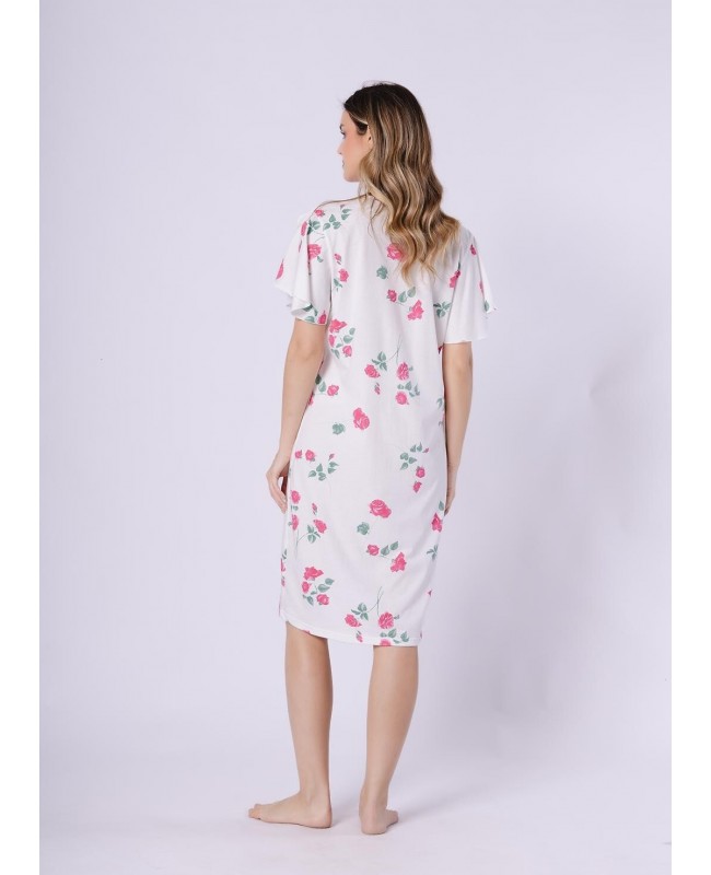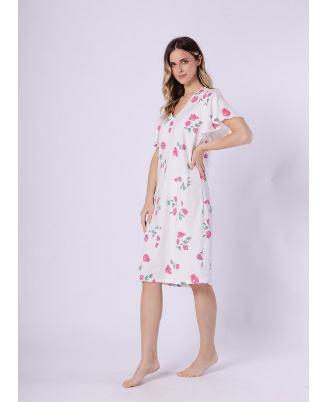 Koszula nocna damska Venus 1726 to połączenie naturalnego komfortu i kobiecego stylu. Wykonana z wysokiej jakości bawełny 100%, jest miękka, przewiewna i przyjazna dla skóry, zapewniając wygodę snu oraz swobodę ruchów. Model wyróżnia się efektownym, kwiatowym printem, który nadaje całości świeżości i lekkości. Dekolt w kształcie litery V optycznie wysmukla sylwetkę, a krótki rękaw typu motylek podkreśla delikatny, kobiecy charakter koszuli. Długość do kolan sprawia, że koszula doskonale sprawdzi się zarówno do snu, jak i domowego relaksu.