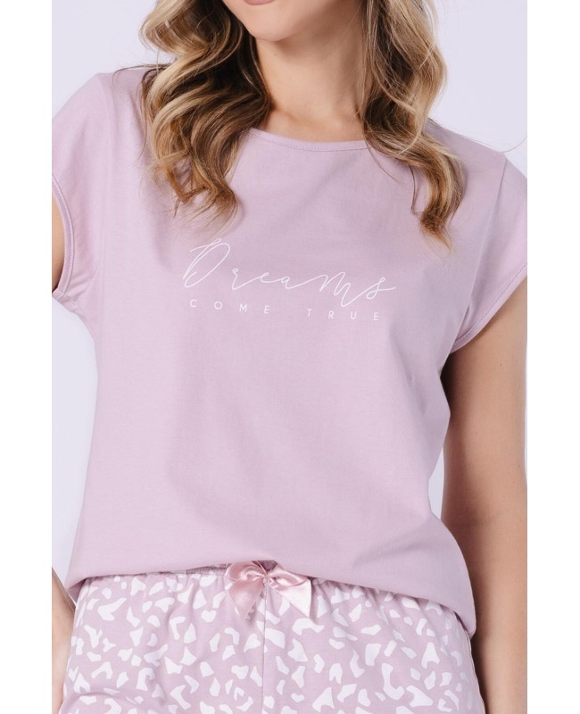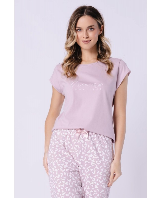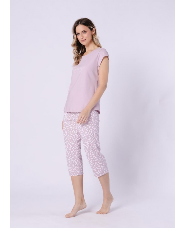Piżama damska Sandra 1708 to wygodna i stylowa propozycja na cieplejsze dni i noce. Wykonana z wysokiej jakości bawełny 100%, jest miękka, oddychająca i przyjazna dla skóry, zapewniając komfort snu oraz swobodę ruchów. Koszulka z krótkim rękawem i półokrągłym dekoltem została ozdobiona delikatnym napisem na przodzie, który nadaje całości subtelnego, kobiecego charakteru. Wzorzyste spodnie o długości 3/4 doskonale sprawdzają się w sezonie wiosenno-letnim. Elastyczna talia obszyta bawełną i ozdobiona kokardką gwarantuje wygodne dopasowanie.