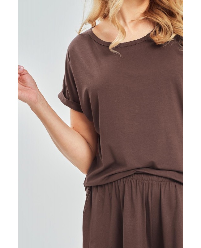 Górna część kompletu to koszulka z krótkim rękawem i półokrągłym dekoltem, która zapewnia wygodę noszenia i klasyczny wygląd. Prosty fason sprawia, że piżama prezentuje się lekko i ponadczasowo.
