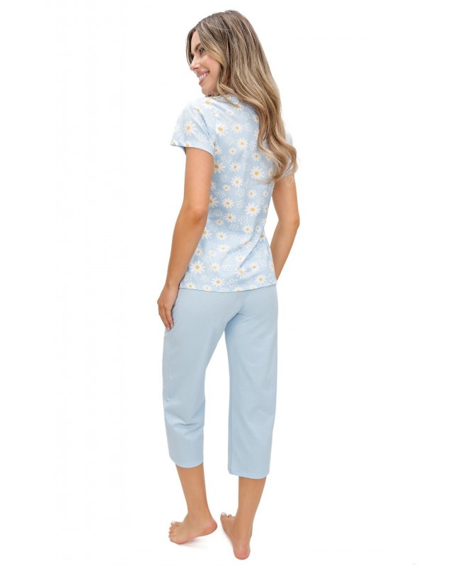 Piżama damska Donna Margaret 3/4 to wygodna i lekka propozycja na wiosnę oraz lato, wykonana w całości z wysokiej jakości bawełny. Naturalna dzianina jest miękka, przewiewna i przyjazna dla skóry, zapewniając komfort snu i codziennego wypoczynku. Koszulka z krótkim rękawem została ozdobiona subtelnym kwiatowym printem oraz posiada klasyczny, okrągły dekolt. Do kompletu jednolite spodnie o długości 3/4, które gwarantują swobodę ruchów i wygodne dopasowanie.