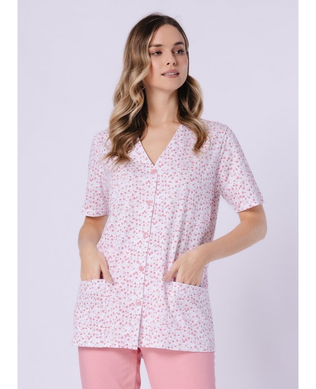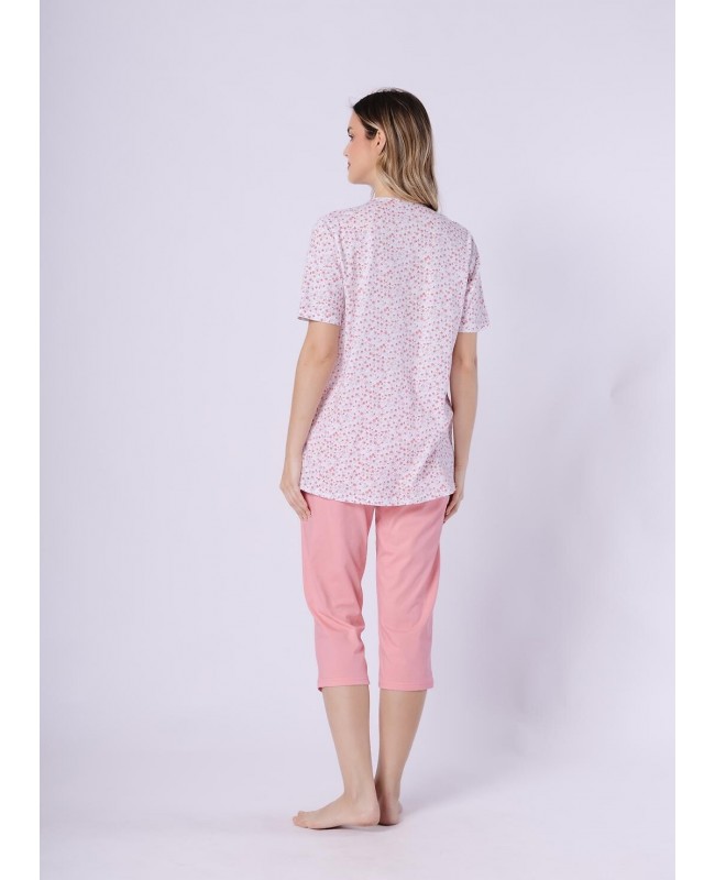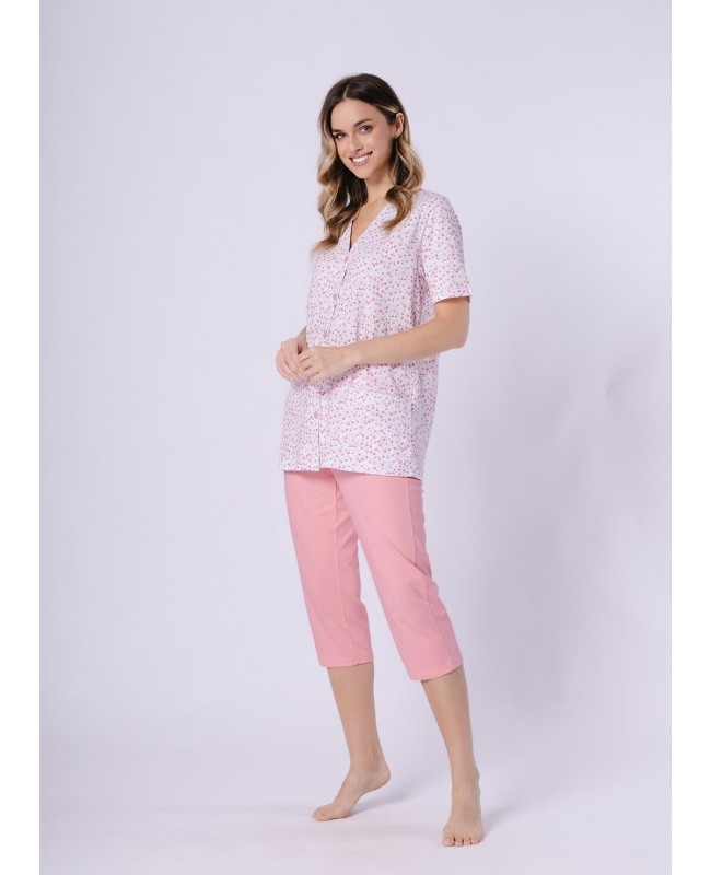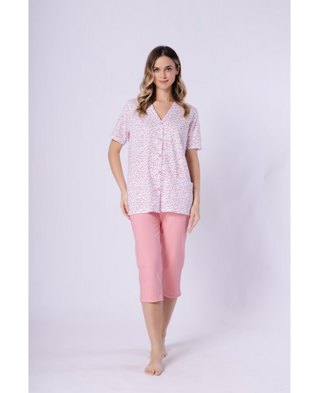 Piżama damska Odetta 1722 to wygodny i kobiecy komplet wykonany w 100% z wysokiej jakości bawełny. Naturalny materiał jest miękki, przewiewny i przyjazny dla skóry, dzięki czemu doskonale sprawdza się podczas snu oraz domowego wypoczynku. Wzorzysta koszulka z krótkim rękawem i dekoltem w kształcie litery V nadaje całości lekkości i subtelnego charakteru. Spodnie o długości 3/4 w jednolitym kolorze zapewniają komfort noszenia i swobodę ruchów.