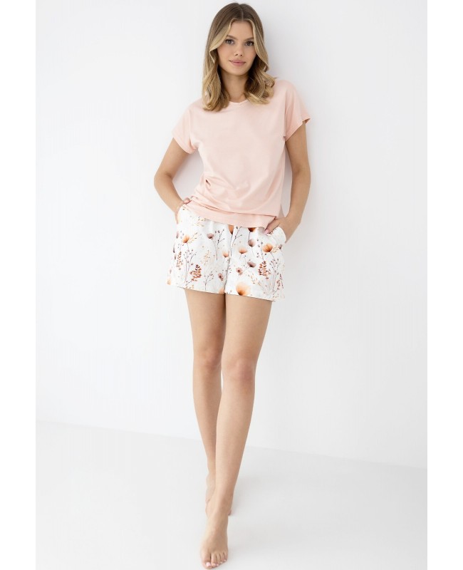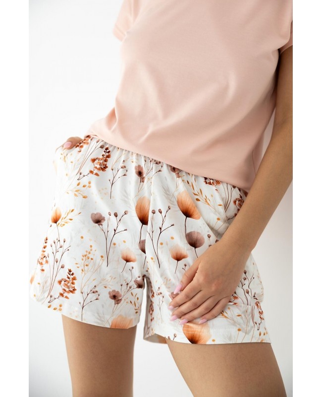 Uzupełnieniem kompletu są krótkie, bawełniane szorty z elastanem, ozdobione kobiecym, kwiatowym wzorem. Lekki fason i praktyczne kieszenie na biodrach sprawiają, że piżama sprawdzi się nie tylko w nocy, ale również podczas porannego relaksu czy spokojnego wieczoru w domu.