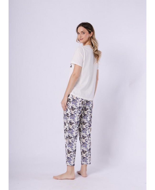 Koszulka z krótkim rękawem i klasycznym, półokrągłym dekoltem to ponadczasowa forma, która nigdy nie wychodzi z mody. Mała kieszonka na wysokości piersi stanowi delikatny akcent dekoracyjny i podkreśla casualowy charakter piżamy. Całość doskonale komponuje się z długimi, wzorzystymi spodniami, które nadają zestawowi lekkości i domowego stylu.
