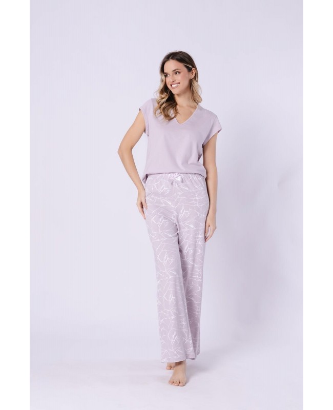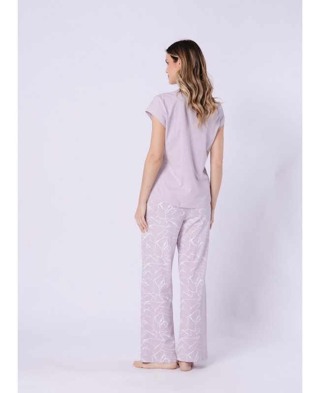 Długie spodnie o wzorzystym wykończeniu wprowadzają nutę lekkości i nowoczesnego stylu. Elastyczna gumka w pasie, obszyta bawełną, zapewnia komfort noszenia przez wiele godzin, a ozdobna kokardka dodaje całości subtelnego uroku. Naturalna bawełna jest przyjemna w dotyku, przewiewna i przyjazna dla skóry, dzięki czemu piżama doskonale sprawdzi się przez cały rok.
