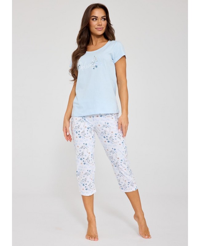 Trzyczęściowa piżama damska Cornette Delicate 466/344 to wyjątkowo praktyczna i komfortowa propozycja dla kobiet ceniących wygodę oraz naturalne materiały. Wykonana w całości z wysokiej jakości bawełny, zapewnia miękkość, przewiewność i komfort noszenia przez całą noc. Koszulka z krótkim rękawem ozdobiona delikatnym nadrukiem doskonale komponuje się z dwiema parami spodni – krótkimi oraz typu rybaczki. Kwiatowy wzór nadaje całości lekkości i kobiecego charakteru, a satynowa kokardka w pasie subtelnie podkreśla estetykę zestawu.