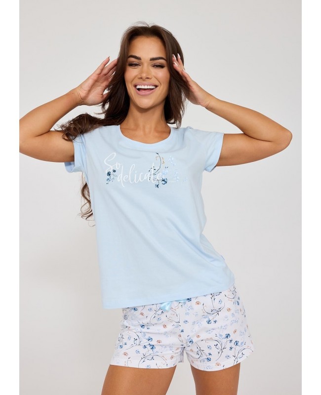 Wyjątkowym atutem tego modelu są dwie pary spodni w komplecie. Krótkie spodenki sprawdzą się idealnie w cieplejsze dni, natomiast spodnie typu rybaczki będą doskonałym wyborem na chłodniejsze wieczory. Całość utrzymana jest w delikatnym, kwiatowym wzorze, który podkreśla kobiecy charakter piżamy. W pasie zastosowano wygodną gumkę oraz ozdobną satynową kokardkę, która stanowi elegancki detal wykończenia.