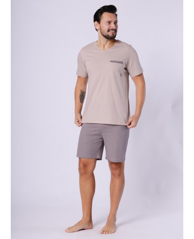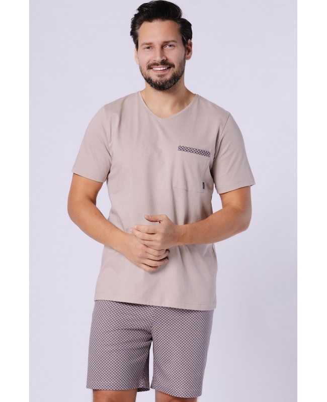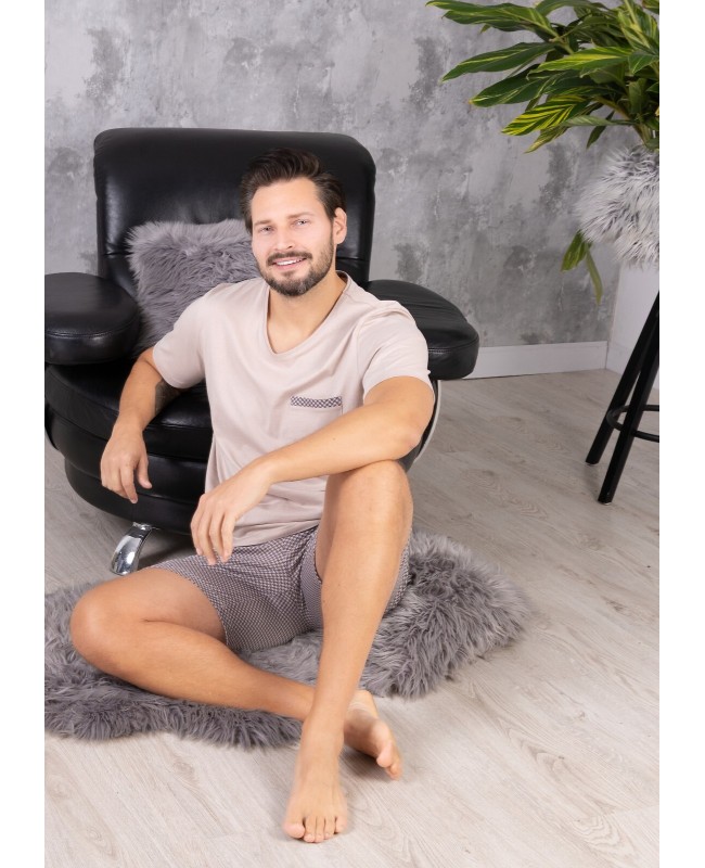 Jednolita koszulka z krótkim rękawem i dekoltem w szpic nadaje całości klasycznego, męskiego charakteru. Naszyta kieszonka na piersi to subtelny, praktyczny detal, który podkreśla casualowy styl piżamy. Krótkie, wzorzyste spodenki urozmaicają zestaw i nadają mu lekkości, a elastyczna gumka obszyta bawełną zapewnia wygodne dopasowanie bez uczucia ucisku.