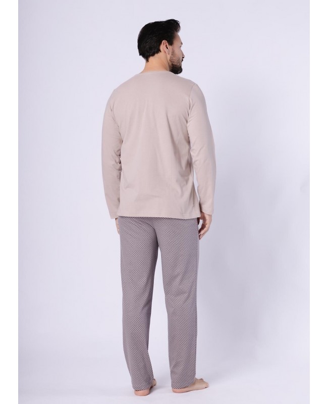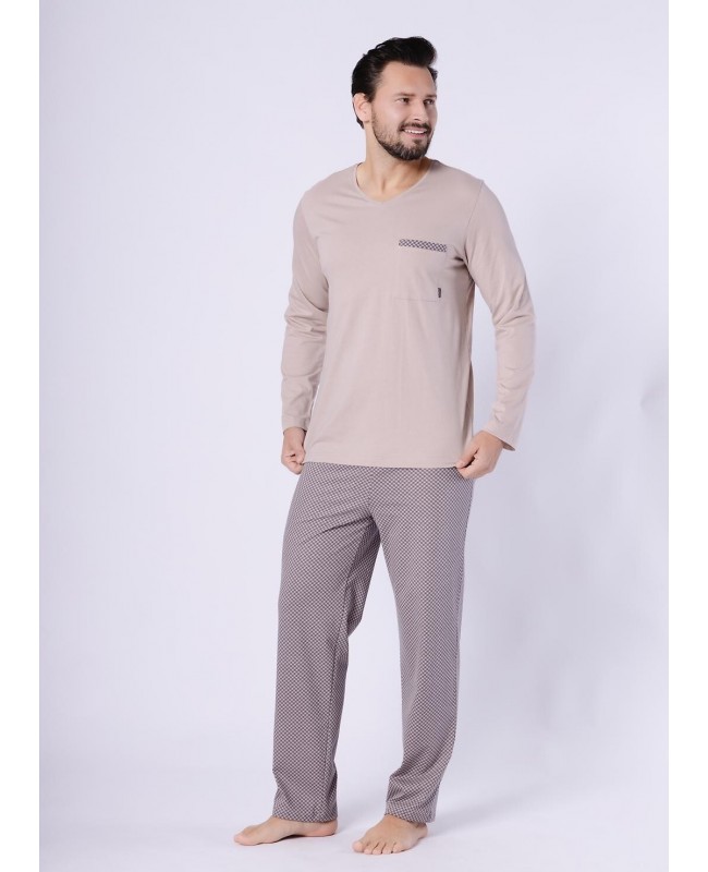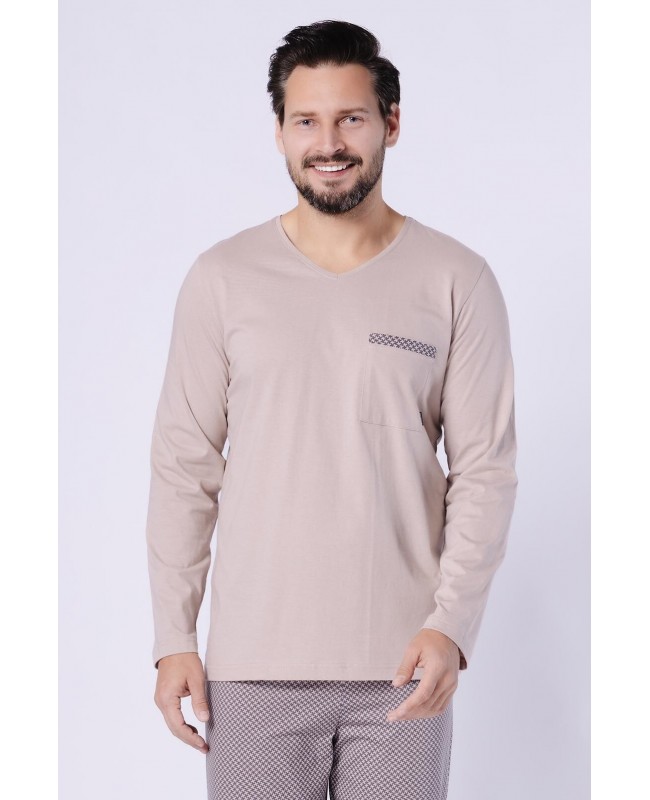 Jednolita koszulka z długim rękawem i dekoltem w szpic nadaje całości klasycznego, męskiego charakteru. Naszyta kieszonka na piersi to praktyczny detal, który podkreśla casualowy styl piżamy. Długie, wzorzyste spodnie urozmaicają zestaw, a elastyczna gumka obszyta bawełną gwarantuje wygodne dopasowanie w pasie bez uczucia ucisku.