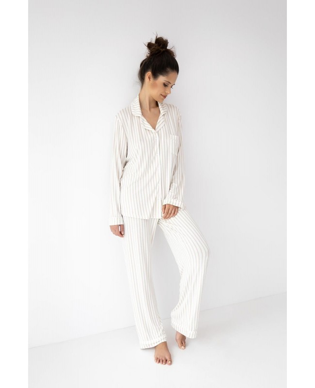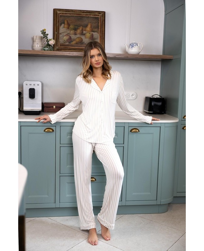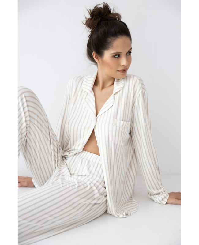 Piżama damska Sensis Amani to stylowa i komfortowa propozycja dla kobiet, które cenią wygodę w eleganckim wydaniu. Wykonana z wysokiej jakości wiskozy z dodatkiem elastanu, jest miękka, lekka i przyjemna w dotyku, a przy tym doskonale oddycha. Rozpinana koszulka z długim rękawem, klasycznym kołnierzykiem i subtelnym printem w paski prezentuje się wyjątkowo schludnie i ponadczasowo. Długie, proste spodnie z elastyczną gumką obszytą dzianiną zapewniają swobodę ruchów oraz komfort noszenia przez całą noc.