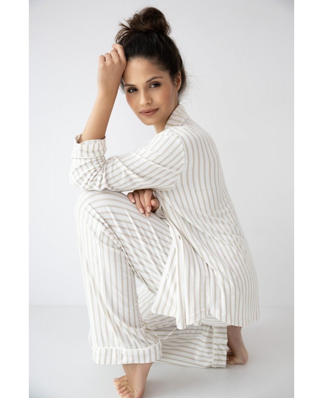 Koszulka z długim rękawem, zapinana na guziki, została uzupełniona o klasyczny kołnierzyk, który nadaje piżamie eleganckiego, niemal koszulowego charakteru. Print w paski jest ponadczasowy i uniwersalny, a naszyta kieszonka na piersi stanowi stylowy akcent podkreślający dopracowane detale. Długie spodnie o prostym kroju gwarantują wygodę i swobodę ruchów, a elastyczna gumka obszyta dzianiną w pasie zapewnia idealne dopasowanie bez uczucia ucisku.