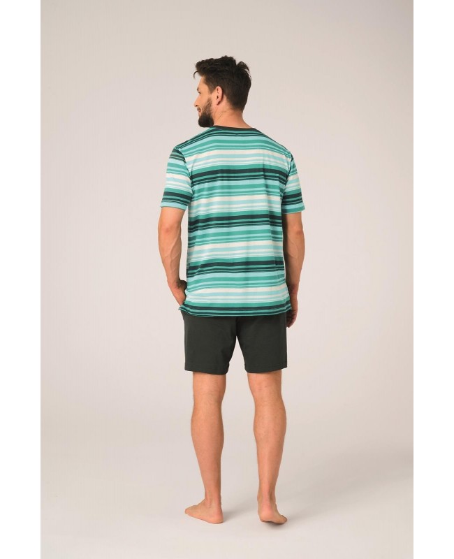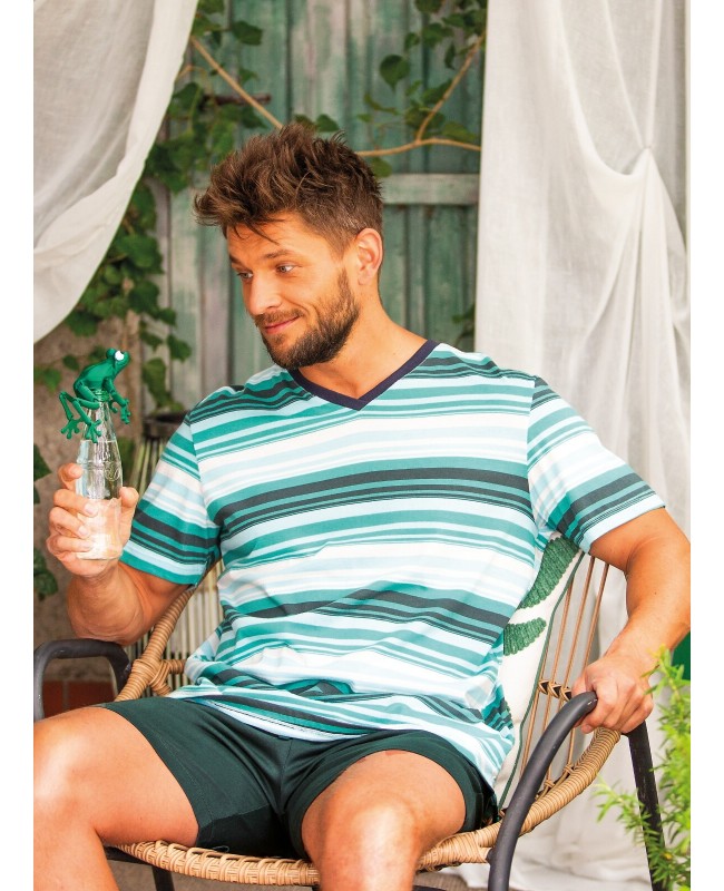 Koszulka z krótkim rękawem i dekoltem w kształcie litery V podkreśla męski charakter fasonu. Wzór w paski dodaje nowoczesności i sprawia, że piżama prezentuje się estetycznie oraz stylowo. To model, który dobrze wygląda nie tylko w sypialni, ale również podczas porannej kawy czy weekendowego relaksu.