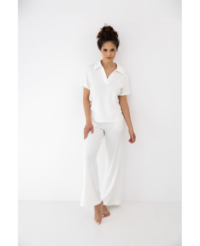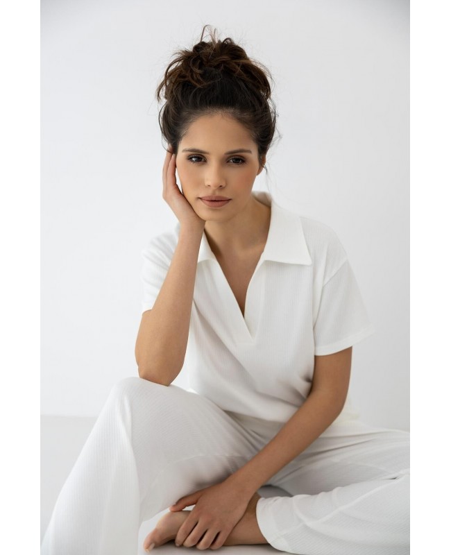 Piżama damska Zuri to wygodny, całoroczny komplet wykonany z wysokiej jakości mieszanki bawełny i modalu z dodatkiem elastanu. Dzianina o subtelnej strukturze w drobny prążek jest miękka, oddychająca i przyjemna dla skóry. Koszulka typu polo z dekoltem w kształcie litery „V” nadaje całości nowoczesnego charakteru, a długie spodnie z lekko rozszerzaną nogawką zapewniają swobodę ruchów. Praktyczne kieszenie podnoszą funkcjonalność. To idealna piżama dla kobiet ceniących komfort i styl w domowym wydaniu.