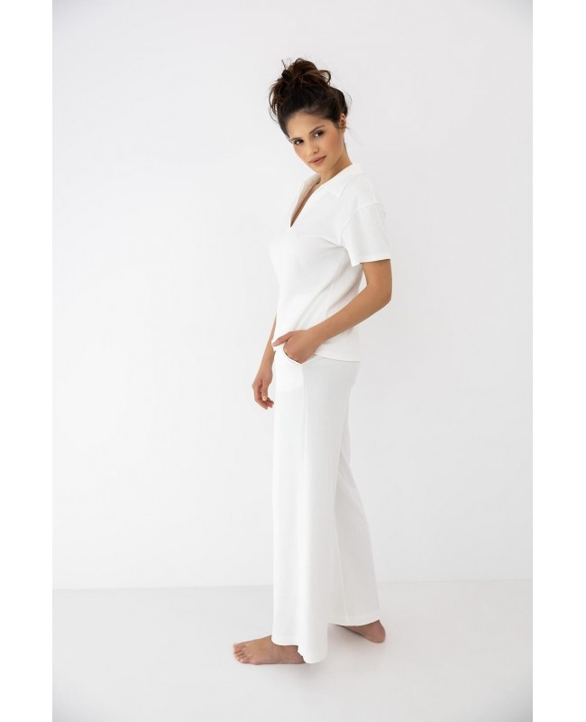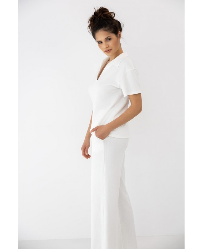 Koszulka typu polo z kobiecym dekoltem „V” łączy sportową swobodę z eleganckim wykończeniem. Krótki rękaw zapewnia wygodę, a luźne, długie spodnie z delikatnie rozszerzaną nogawką pięknie układają się podczas ruchu i nie krępują ciała. Wygodne kieszenie na biodrach to praktyczny detal, który docenisz każdego dnia.