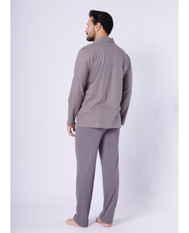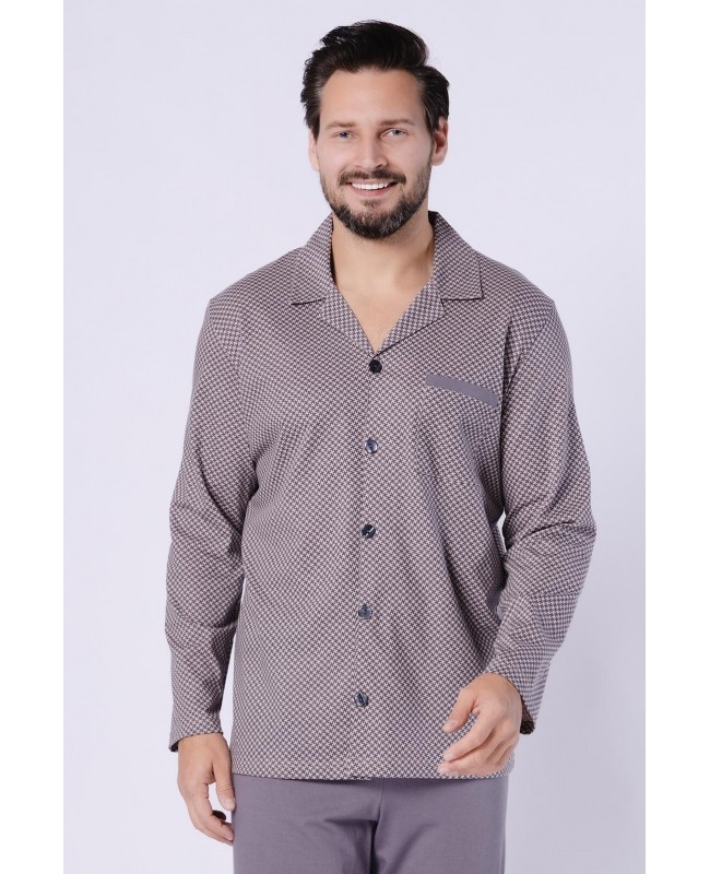 Bawełniana piżama męska Marcel 1754 to klasyczny, rozpinany model z długim rękawem i kołnierzykiem, stworzony z myślą o komforcie przez cały rok. Wykonana w 100% z naturalnej bawełny, zapewnia skórze swobodę oddychania oraz wygodę podczas snu i wypoczynku w domu. Bluza zapinana na guziki z praktyczną kieszonką na piersi nadaje jej elegancki, ponadczasowy charakter. Długie, jednolite spodnie dopełniają całość, tworząc wygodny komplet dla mężczyzn ceniących jakość, funkcjonalność i tradycyjny styl.