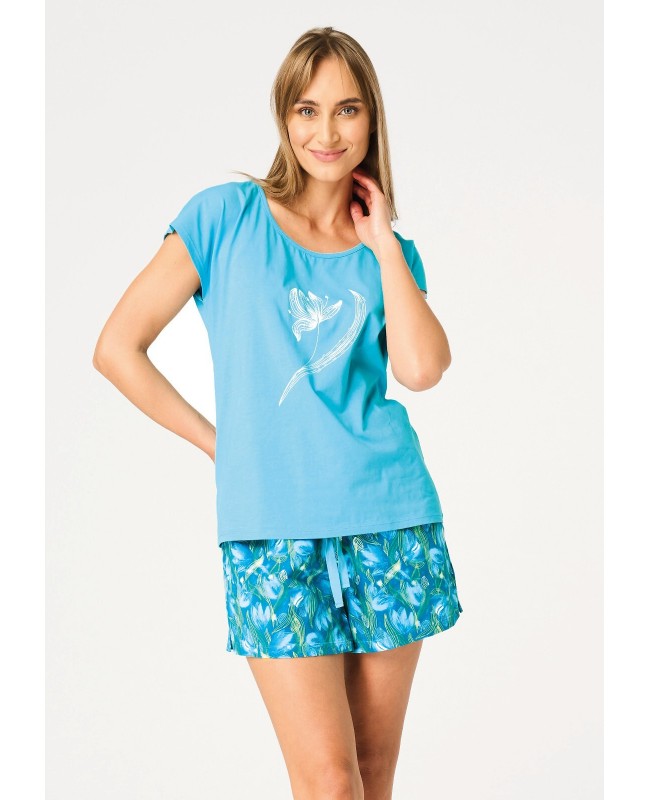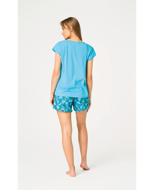 Wzorzyste, krótkie spodenki doskonale równoważą jednolitą górę. Luźny krój zapewnia pełną swobodę ruchów, a wygodne kieszenie na biodrach zwiększają funkcjonalność kompletu. To praktyczne rozwiązanie, które sprawdzi się nie tylko podczas snu, ale także w trakcie domowego relaksu.
