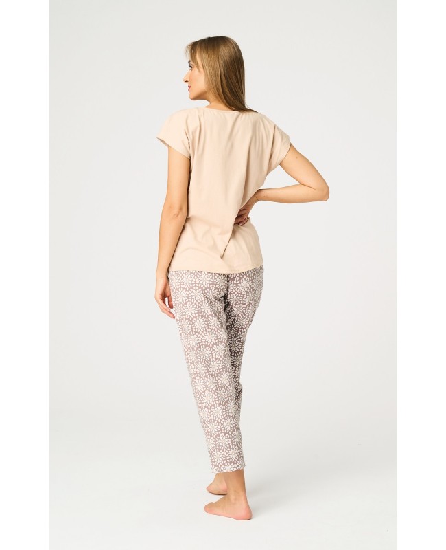 Piżama damska Key LNS 735 A26 to komfortowy komplet wykonany z wysokiej jakości bawełny z dodatkiem elastanu, który zapewnia przewiewność i idealne dopasowanie. Gładka bluzka z krótkim rękawem została ozdobiona subtelnym nadrukiem z delikatnie połyskującą cyrkonią, dodając całości kobiecego charakteru. W zestawie znajdują się wzorzyste spodnie o długości 7/8 z praktycznymi kieszeniami na biodrach. To doskonały wybór dla kobiet ceniących wygodę, styl i swobodę ruchów podczas snu oraz domowego relaksu.
